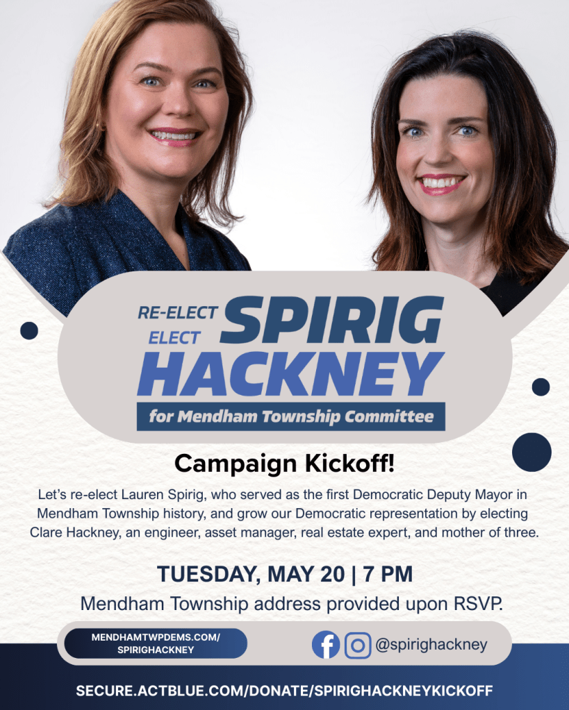 Lauren Spirig & Clare Hackney for Mendham Township Committee announce their campaign kickoff event, Tuesday, May 20 at 7 p.m. RSVP for address.
